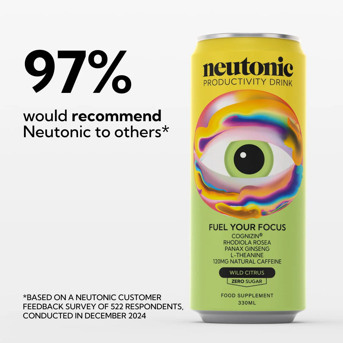 Each can contains our premier blend of nootropics: Cognizin® 500mg, Rhodiola Rosea 400mg, L-Theanine 400mg and 200mg of Panax Ginseng, as well as 120mg of Caffeine and 100% RI of 8 B Vitamins.